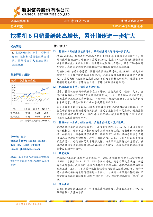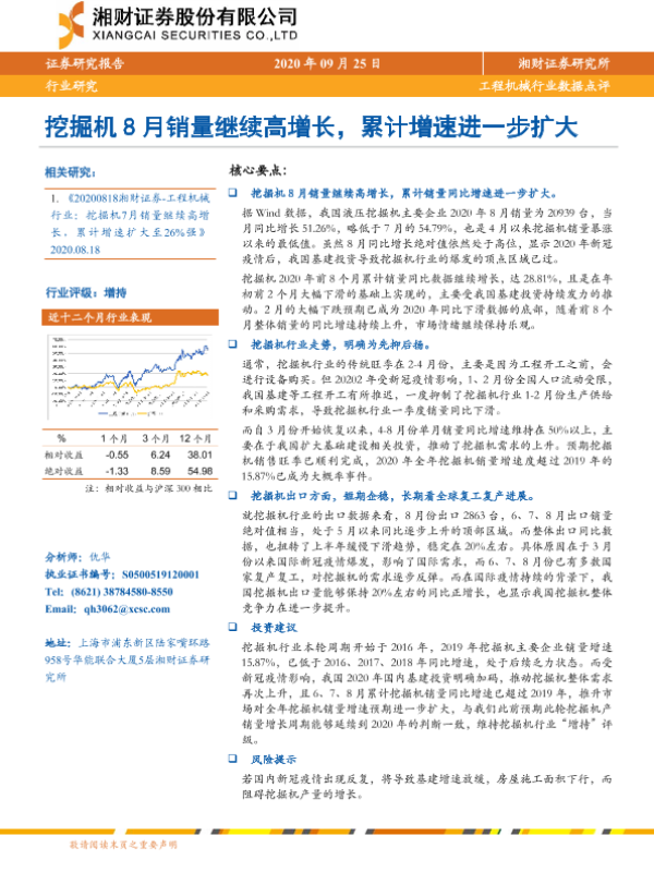 【湘财证券】【20200925】工程机械行业数据点评:挖掘机8月销量继续高增长,累计增速进一步扩大-6页