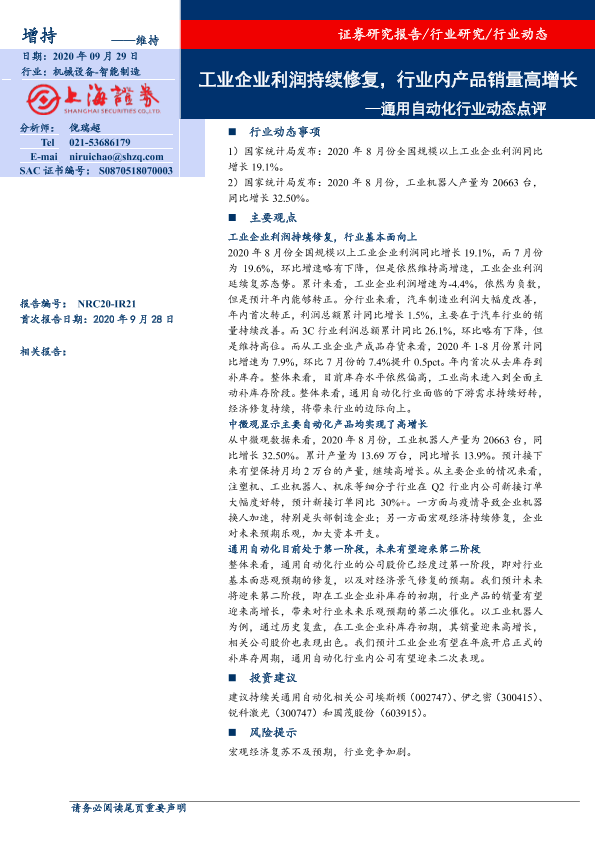 【上海证券】【20200928】通用自动化行业动态点评:工业企业利润持续修复,行业内产品销量高增长-2页