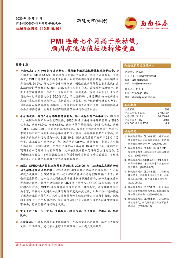 【西南证券】【20201011】20201011-西南证券-机械行业周报:PMI连续七个月高于荣枯线,顺周期低估值板块持续受益-25页