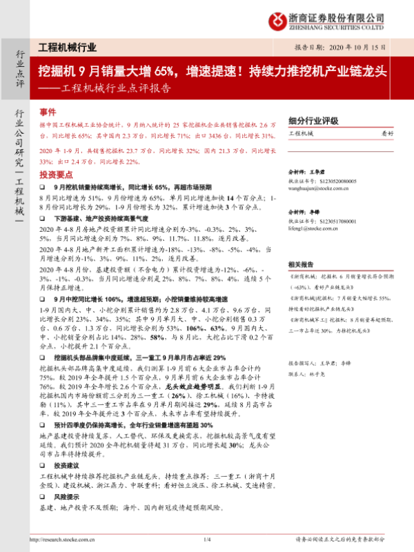 【浙商证券】【20201015】20201015-浙商证券-工程机械行业点评报告:挖掘机9月销量大增65%,增速提速!持续力推挖机产业链龙头-4页