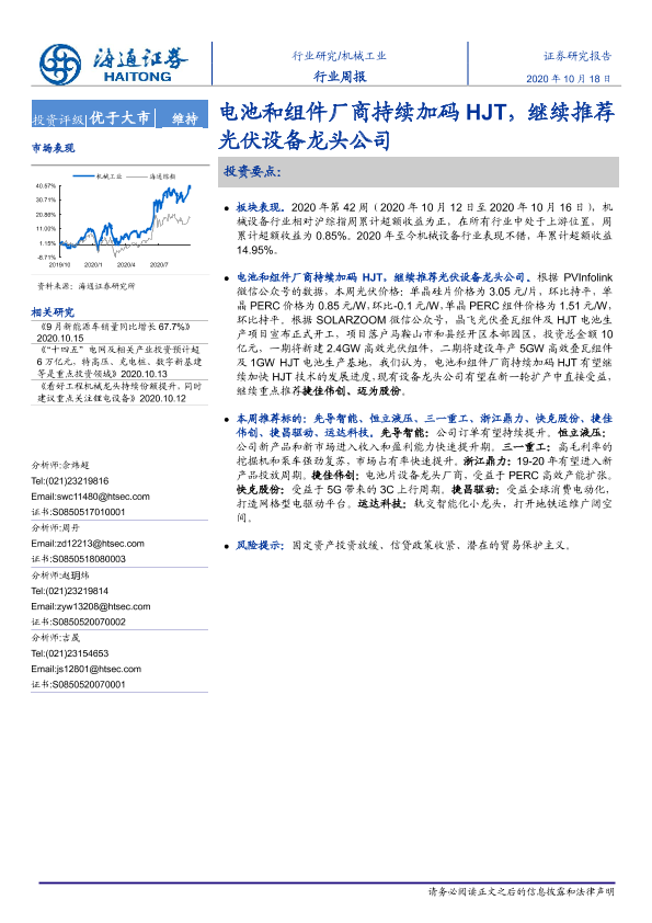 【海通证券】【20201018】20201018-海通证券-机械工业行业周报:电池和组件厂商持续加码HJT,继续推荐光伏设备龙头公司-10页