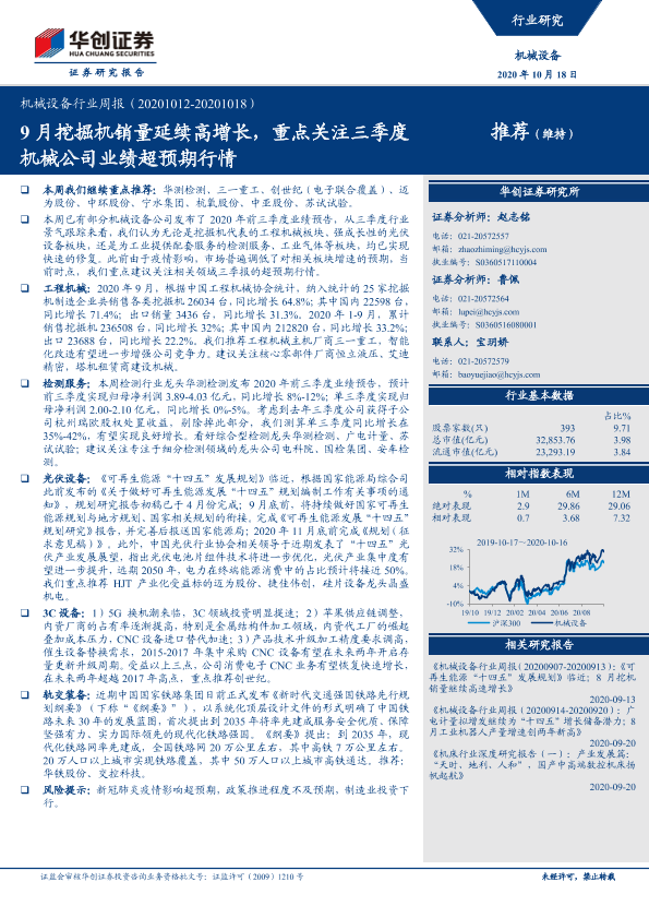 【华创证券】【20201018】20201018-华创证券-机械设备行业周报:9月挖掘机销量延续高增长,重点关注三季度机械公司业绩超预期行情-10页