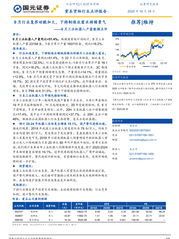 【国元证券】【20201019】9月工业机器人产量数据点评-9月行业复苏动能加大,下游制造业需求持续景气-3页