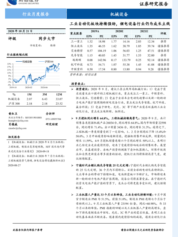 【财信证券】【20201021】机械设备行业月度报告:工业自动化板块持续强劲,锂电设备行业仍为成长主线-13页