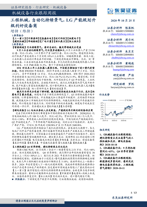 【东吴证券】【20201025】20201025-东吴证券-机械设备行业跟踪周报:工程机械、自动化持续景气,LG产能规划升级利好设备商-13页