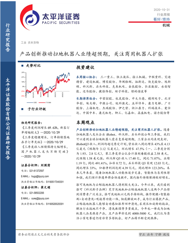 【太平洋证券】【20201031】20201031-太平洋-机械行业周报:产品创新推动扫地机器人业绩超预期,关注商用机器人扩张-16页