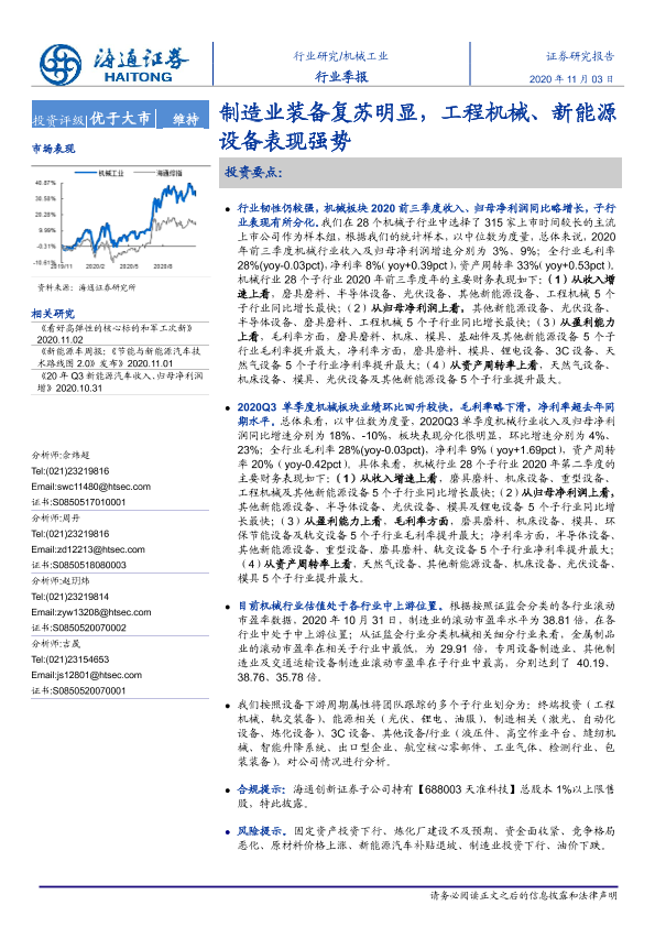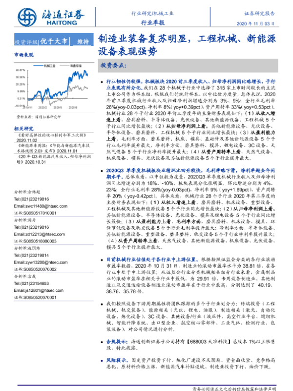 【海通证券】【20201103】机械工业行业季报:制造业装备复苏明显,工程机械、新能源设备表现强势-32页