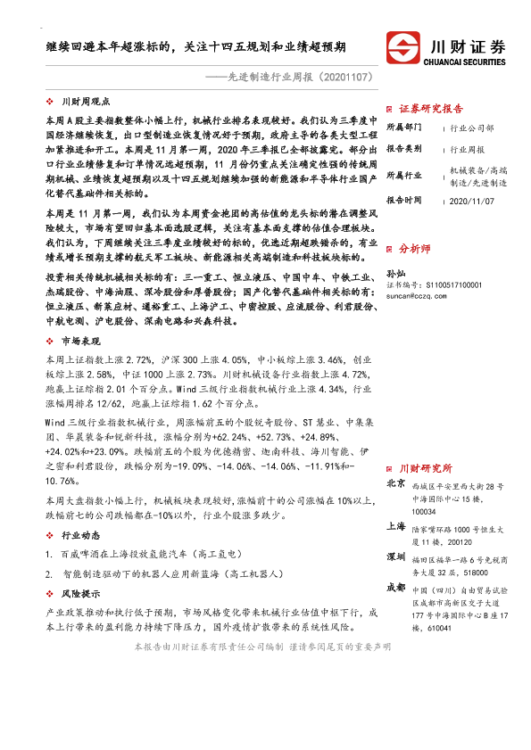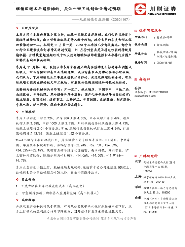 【川财证券】【20201107】20201107-川财证券-先进制造行业周报:继续回避本年超涨标的,关注十四五规划和业绩超预期-10页