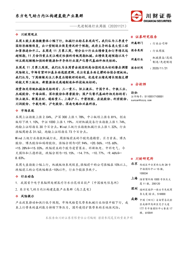 【川财证券】【20201121】20201121-川财证券-先进制造行业周报:东方电气助力内江构建氢能产业集群-10页