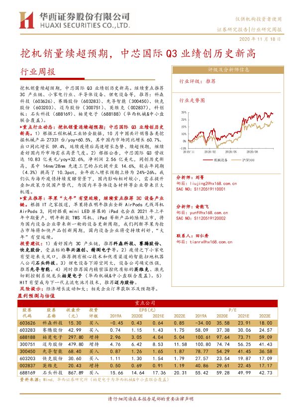 【华西证券】【20201118】20201118-华西证券-机械设备行业周报:挖机销量续超预期,中芯国际Q3业绩创历史新高-20页