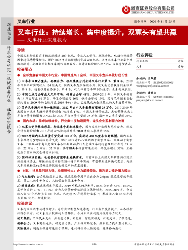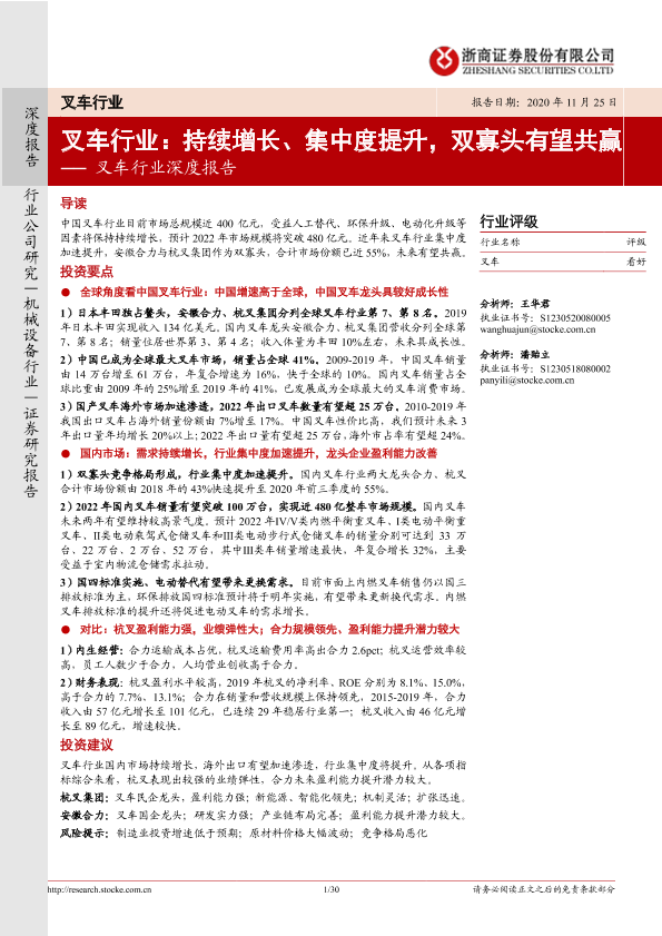 【浙商证券】【20201125】叉车行业:持续增长、集中度提升,双寡头有望共赢-30页