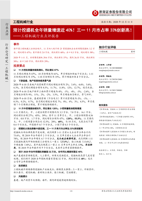 【浙商证券】【20201211】20201211-浙商证券-工程机械行业点评报告:预计挖掘机全年销量增速近40%!三一11月市占率33%创新高!-4页