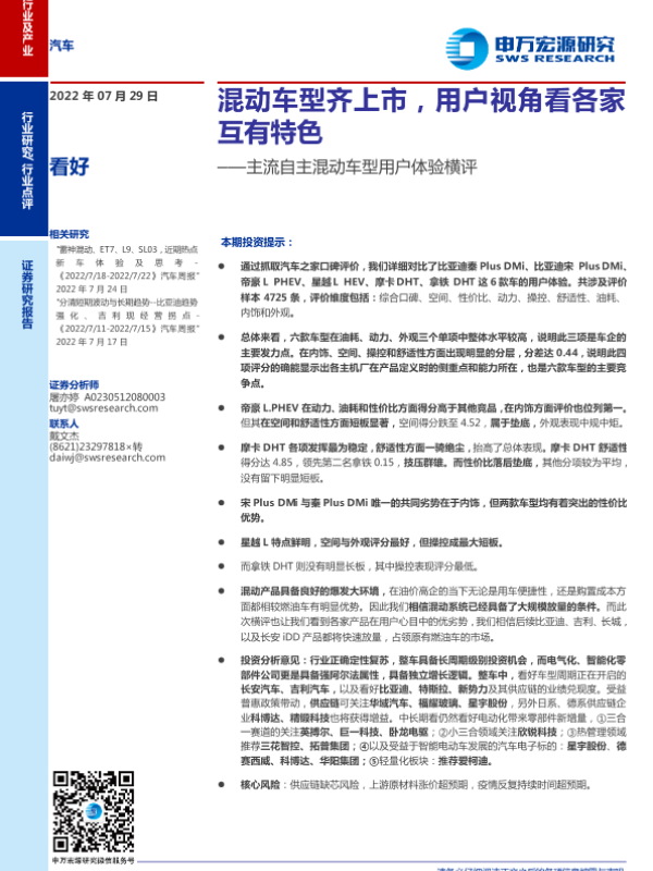 【申万宏源】【20220729】汽车行业主流自主混动车型用户体验横评:混动车型齐上市,用户视角看各家互有特色-20页