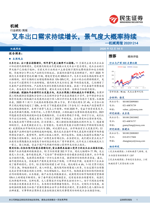 【民生证券】【20201214】20201214-民生证券-机械周报:叉车出口需求持续增长,景气度大概率持续-21页