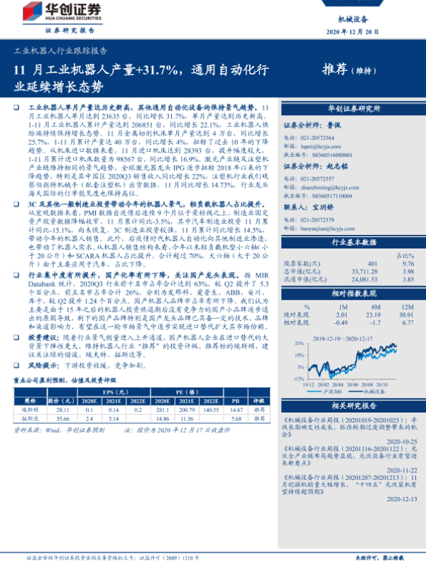 【华创证券】【20201220】工业机器人行业跟踪报告:11月工业机器人产量+31.7%,通用自动化行业延续增长态势-11页