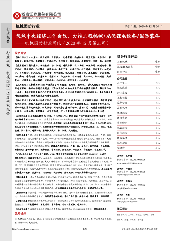 【浙商证券】【20201220】机械国防行业周报(2020年12月第三周):聚焦中央经济工作会议,力推工程机械 光伏锂电设备 国防装备-20页