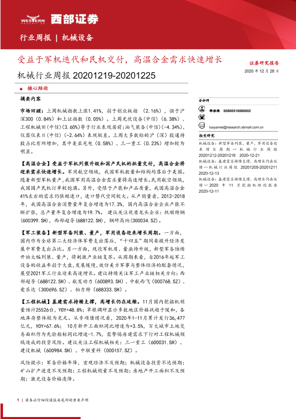 【西部证券】【20201228】20201228-西部证券-机械行业周报:受益于军机迭代和民机交付,高温合金需求快速增长-12页
