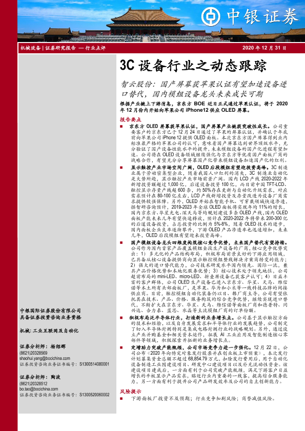 【中银证券】【20201231】3C设备行业之动态跟踪:智云股份:国产屏幕获苹果认证有望加速设备进口替代,国内模组设备龙头未来成长可期-3页