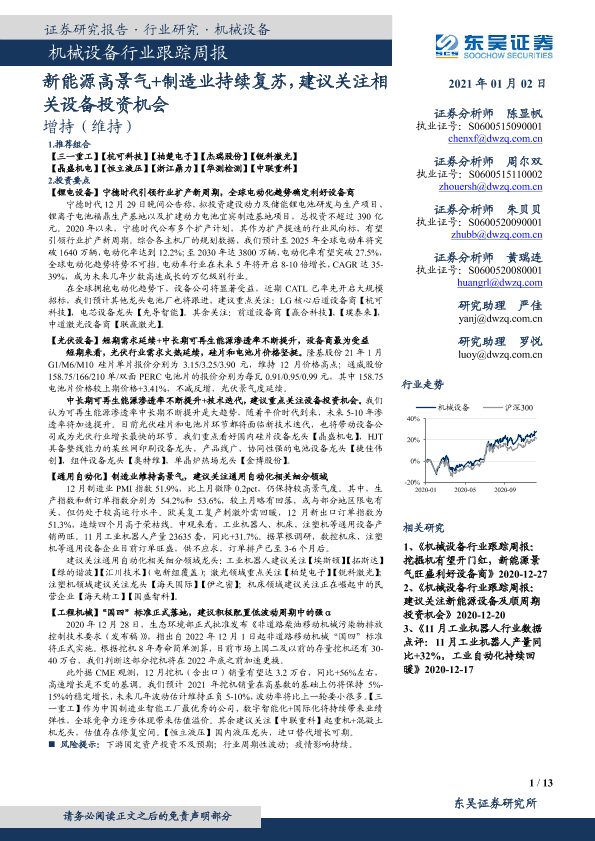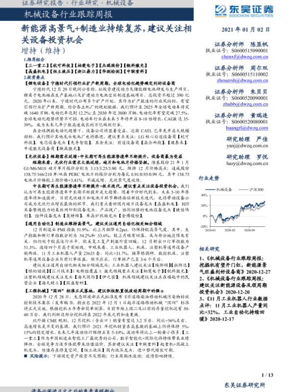 【东吴证券】【20210102】20210102-东吴证券-机械设备行业跟踪周报:新能源高景气+制造业持续复苏,建议关注相关设备投资机会-13页