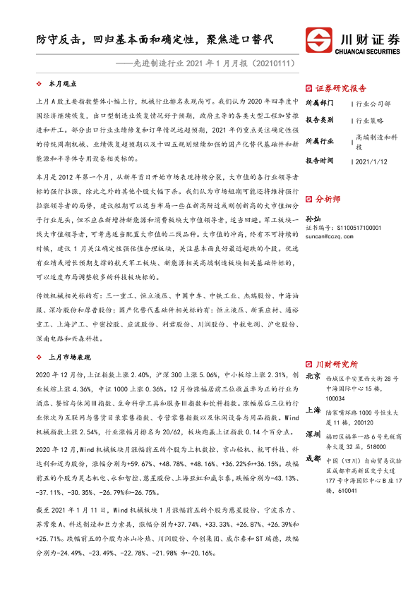 【川财证券】【20210112】先进制造行业2021年1月月报:防守反击,回归基本面和确定性,聚焦进口替代-15页