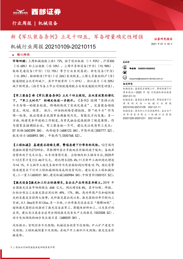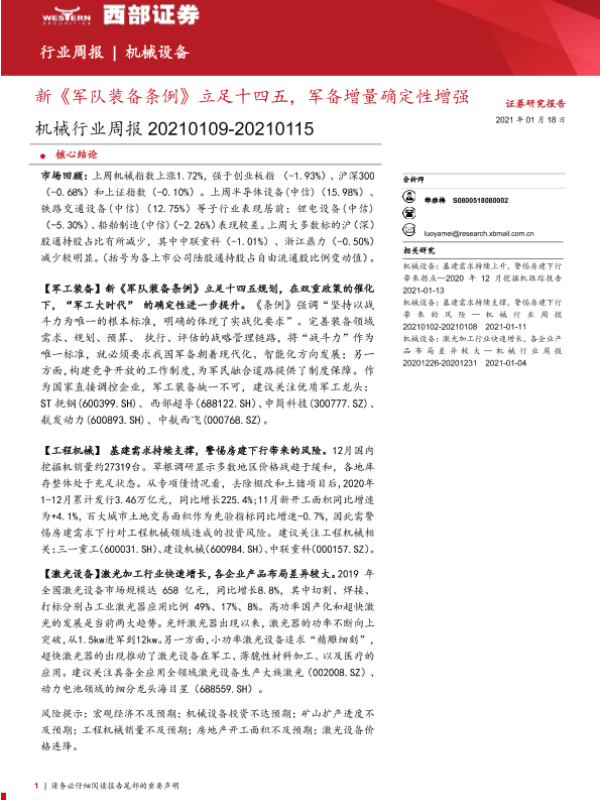 【西部证券】【20210118】20210118-西部证券-机械行业周报:新《军队装备条例》立足十四五,军备增量确定性增强-11页