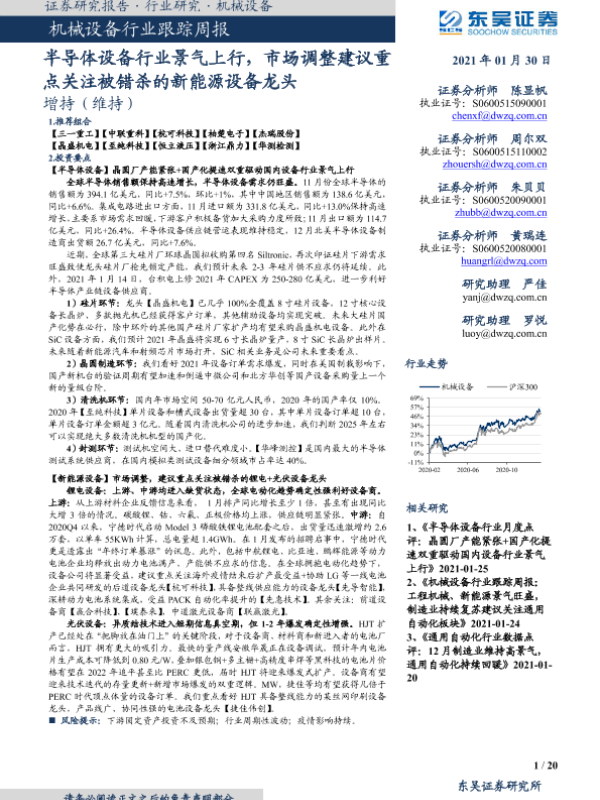 【东吴证券】【20210130】20210130-东吴证券-机械设备行业跟踪周报:半导体设备行业景气上行,市场调整建议重点关注被错杀的新能源设备龙头-20页