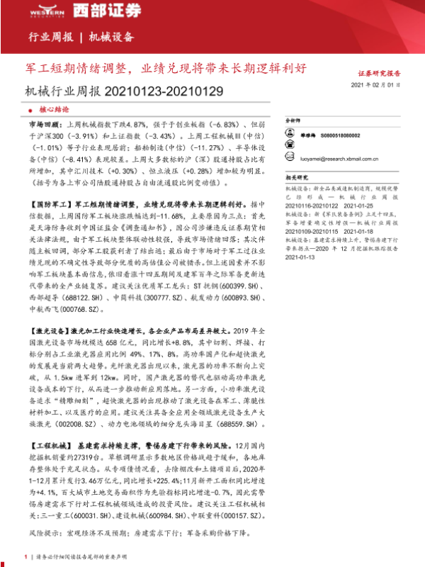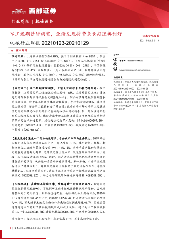 【西部证券】【20210201】20210201-西部证券-机械行业周报:军工短期情绪调整,业绩兑现将带来长期逻辑利好-12页
