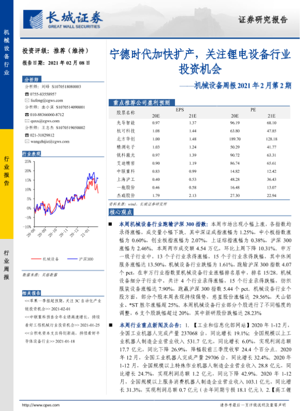 【长城证券】【20210208】机械设备周报2021年2月第2期:宁德时代加快扩产,关注锂电设备行业投资机会-14页