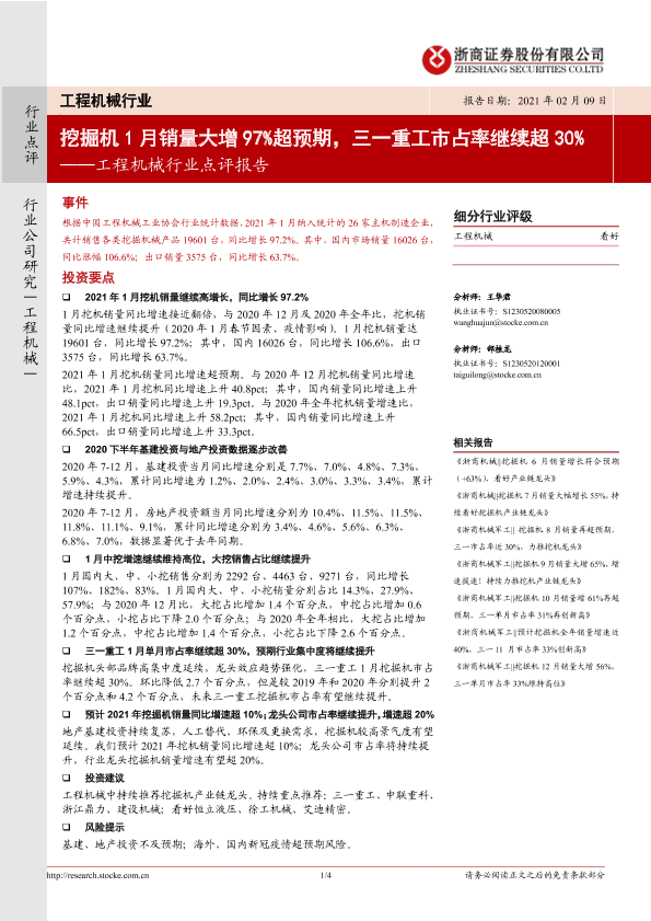 【浙商证券】【20210209】20210209-浙商证券-工程机械行业点评报告:挖掘机1月销量大增97%超预期,三一重工市占率继续超30%-4页