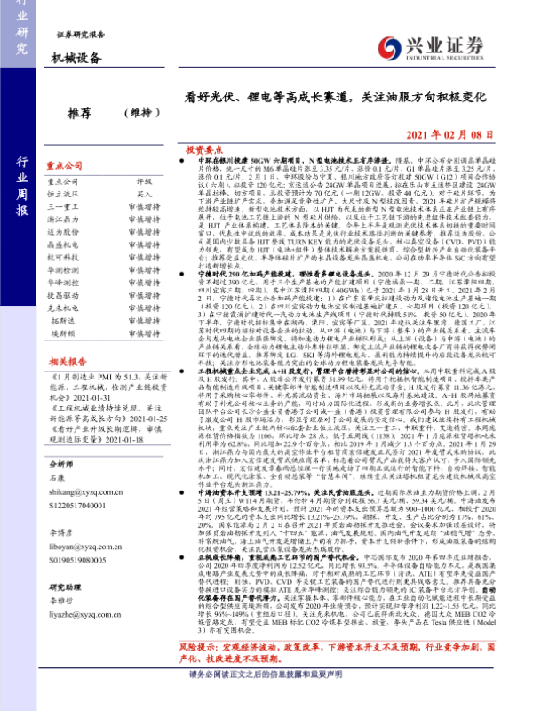 【兴业证券】【20210208】20210208-兴业证券-机械设备行业周报:看好光伏、锂电等高成长赛道,关注油服方向积极变化-22页