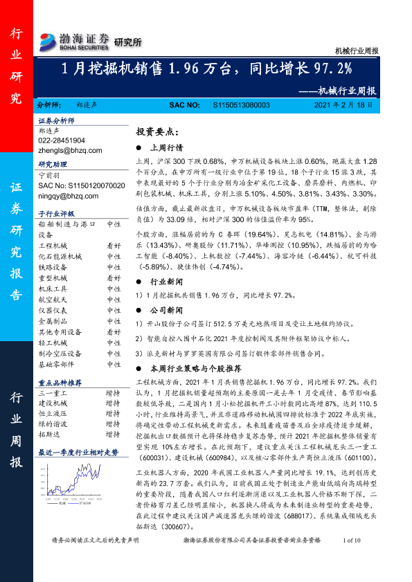 【渤海证券】【20210218】20210218-渤海证券-机械行业周报:1月挖掘机销售1.96万台,同比增长97.2%-10页
