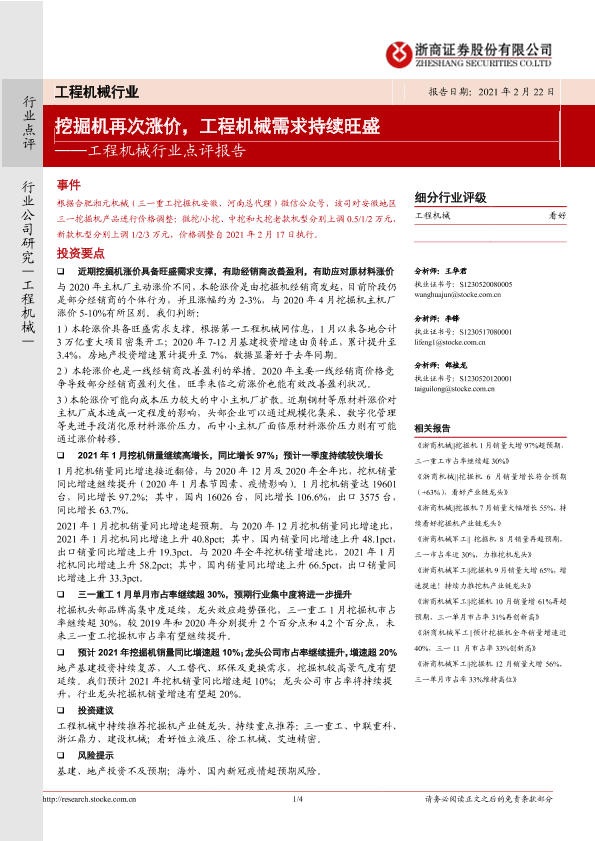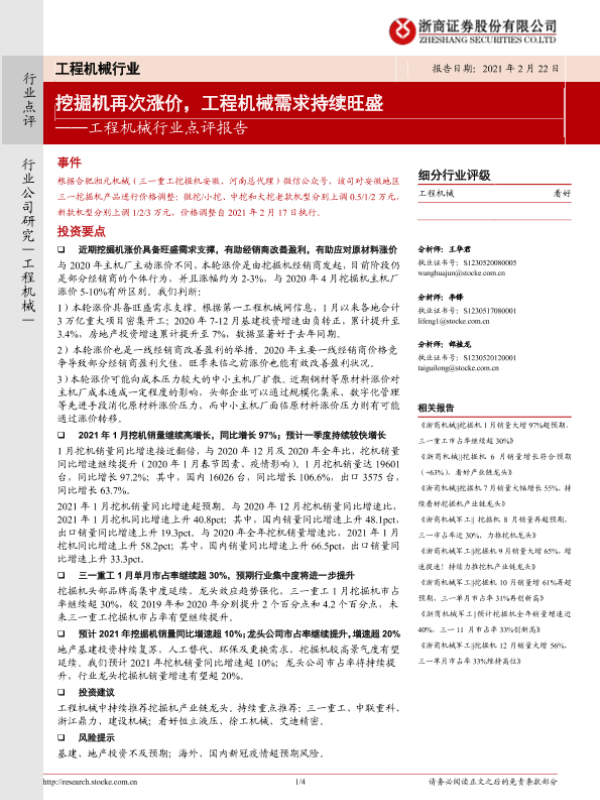 【浙商证券】【20210222】20210222-浙商证券-工程机械行业点评报告:挖掘机再次涨价,工程机械需求持续旺盛-4页