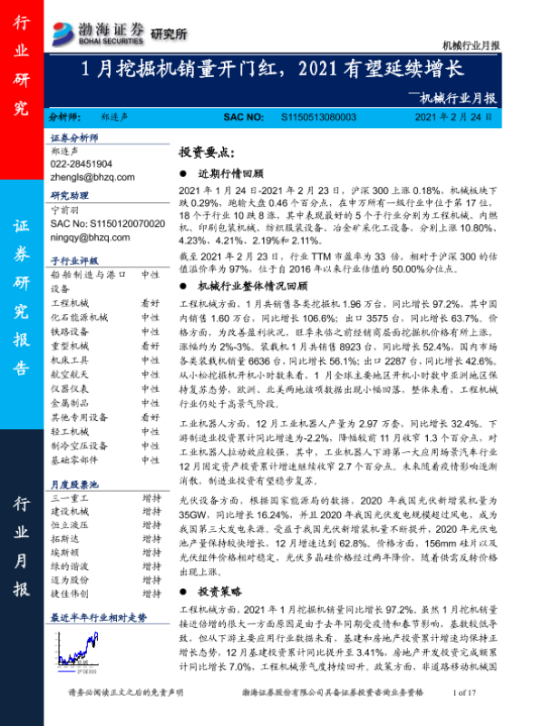【渤海证券】【20210224】20210224-渤海证券-机械行业月报:1月挖掘机销量开门红,2021有望延续增长-17页