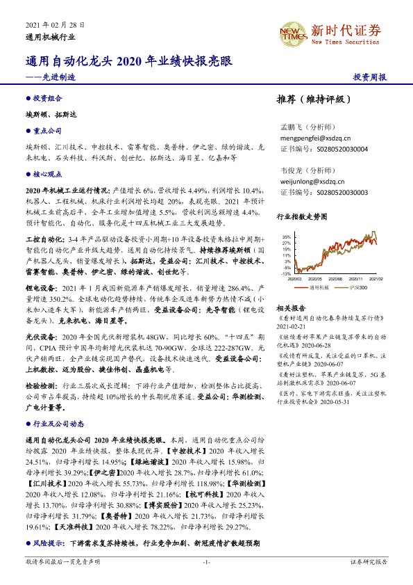业绩快报 投资组合 自动化 行业趋势 通用机械