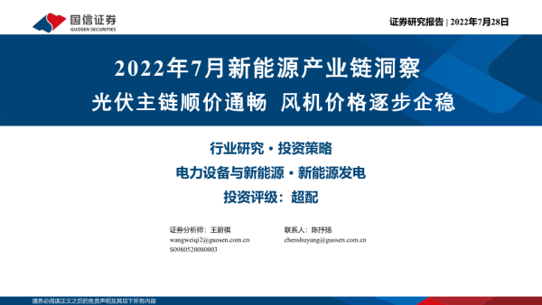 【国信证券】【20220728】电力设备与新能源行业:2022年7月新能源产业链洞察,光伏主链顺价通畅,风机价格逐步企稳-38页