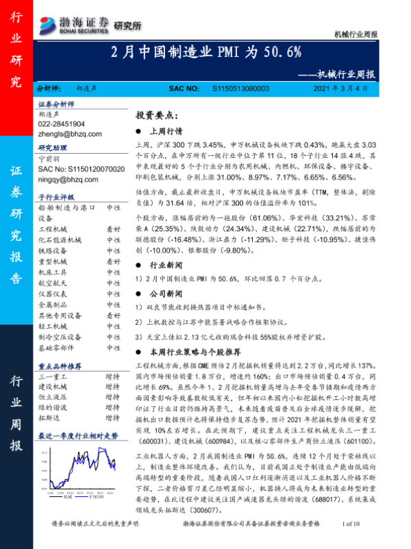 【渤海证券】【20210304】20210304-渤海证券-机械行业周报:2月中国制造业PMI为50.6%-10页