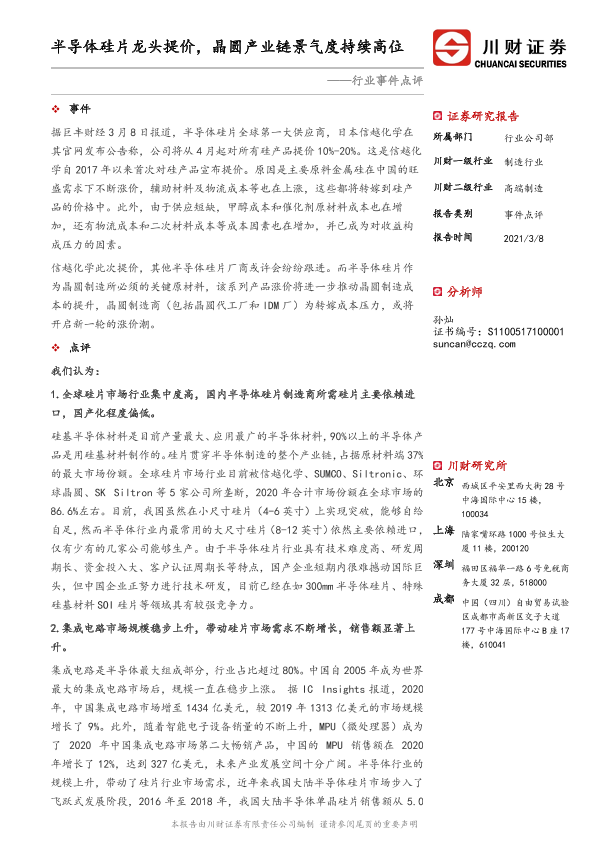 【川财证券】【20210308】高端制造行业事件点评:半导体硅片龙头提价,晶圆产业链景气度持续高位-3页