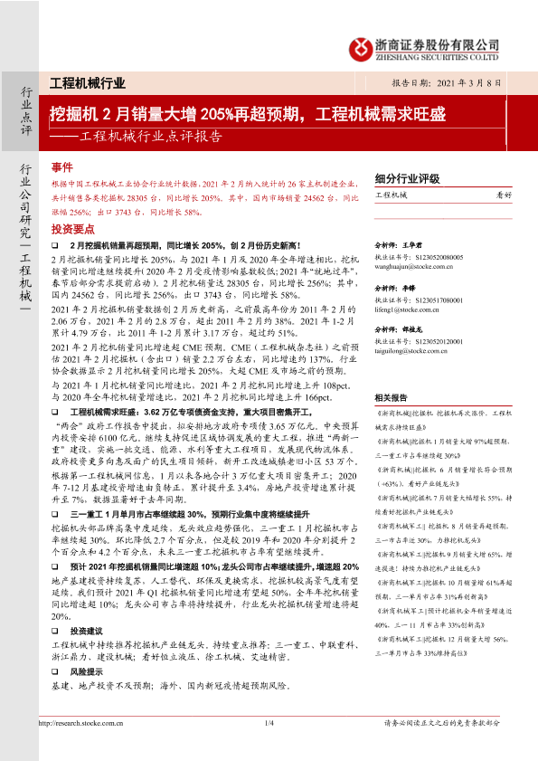 【浙商证券】【20210308】20210308-浙商证券-工程机械行业点评报告:挖掘机2月销量大增205%再超预期,工程机械需求旺盛-4页