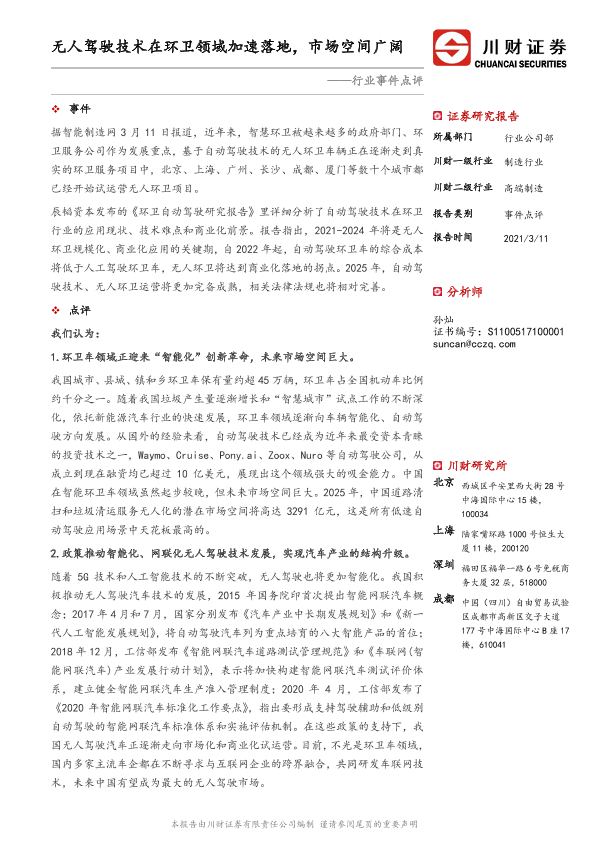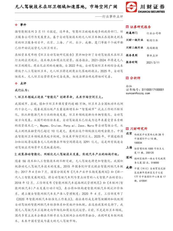 【川财证券】【20210311】高端制造行业事件点评:无人驾驶技术在环卫领域加速落地,市场空间广阔-3页