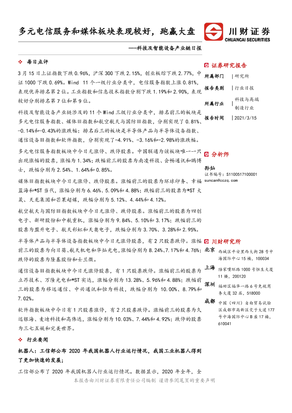 【川财证券】【20210315】科技及智能设备产业链日报:多元电信服务和媒体板块表现较好,跑赢大盘-3页