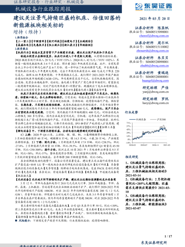 【东吴证券】【20210320】20210320-东吴证券-机械设备行业跟踪周报:建议关注景气持续旺盛的机床、估值回落的新能源板块相关标的-17页