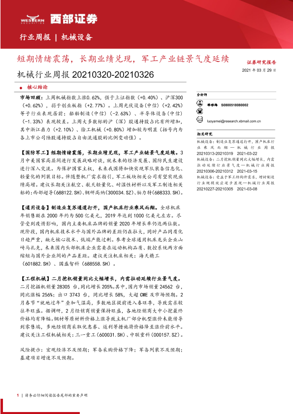 【西部证券】【20210329】20210329-西部证券-机械行业周报:短期情绪震荡,长期业绩兑现,军工产业链景气度延续-12页