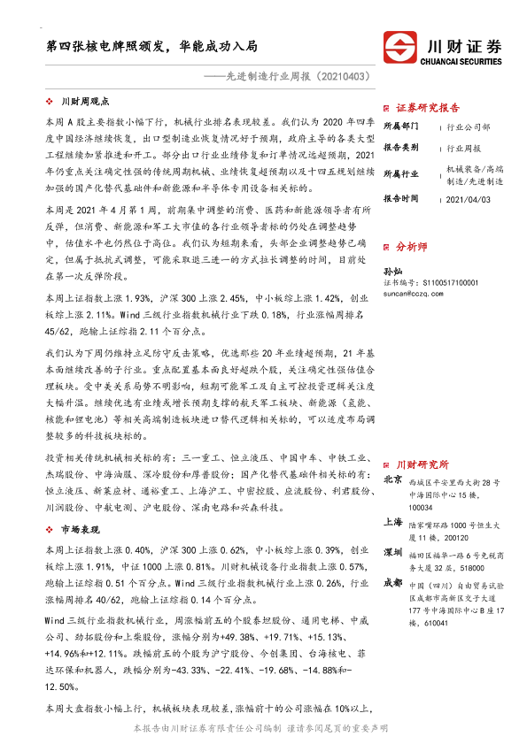 【川财证券】【20210403】20210403-川财证券-先进制造行业周报:第四张核电牌照颁发,华能成功入局-13页