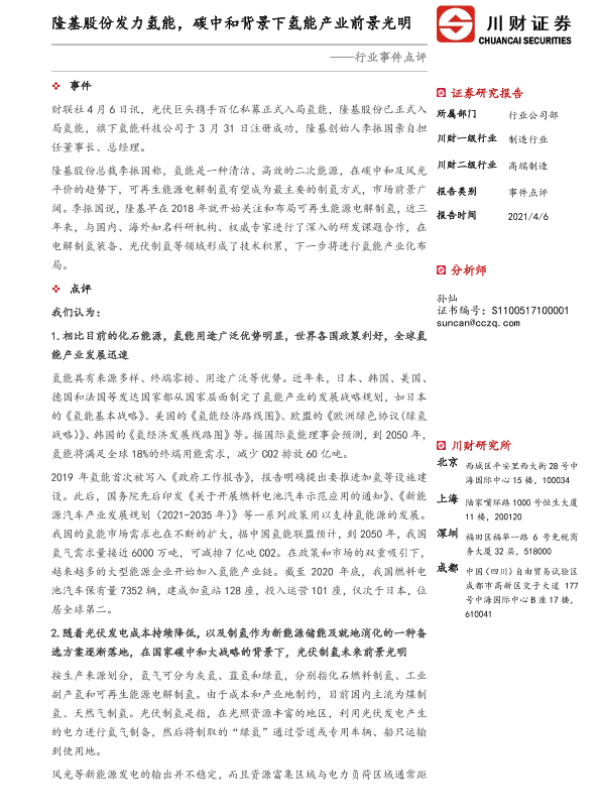【川财证券】【20210406】高端制造行业事件点评:隆基股份发力氢能,碳中和背景下氢能产业前景光明-3页