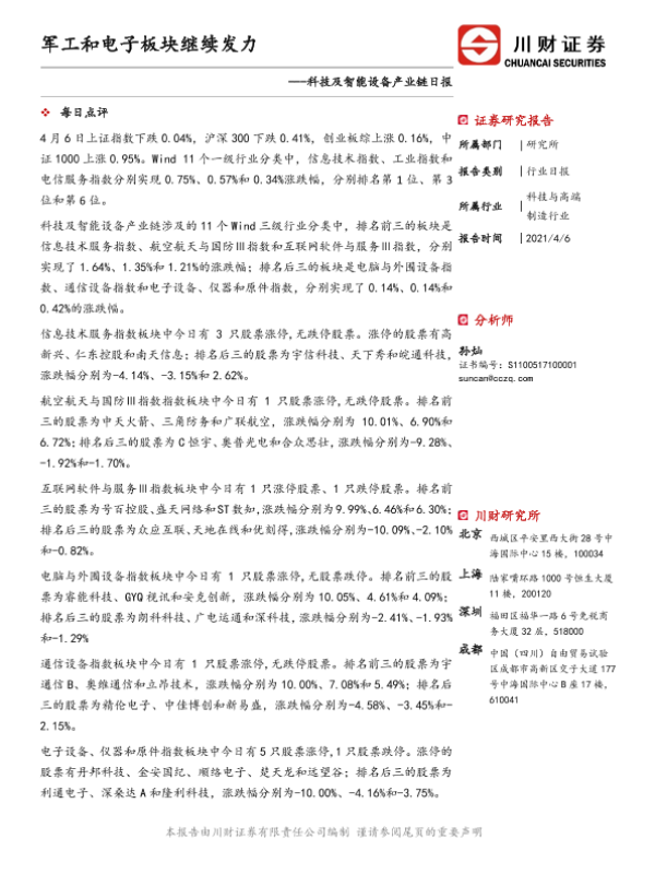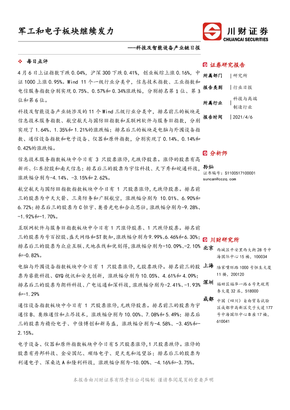 【川财证券】【20210406】科技及智能设备产业链日报:军工和电子板块继续发力-4页