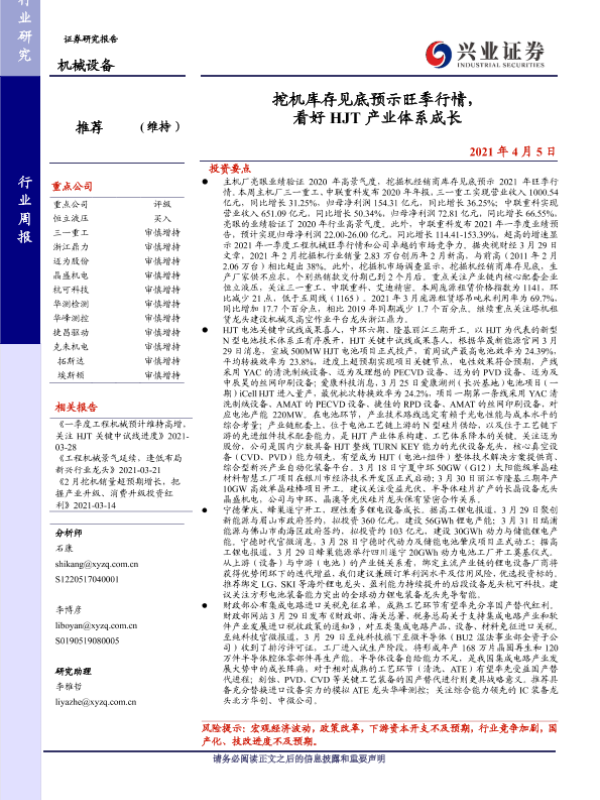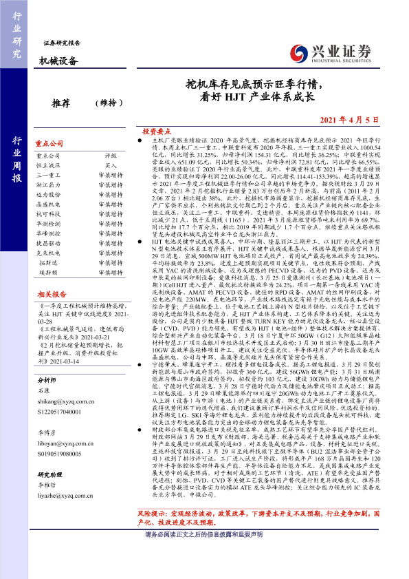 【兴业证券】【20210405】20210405-兴业证券-机械设备行业周报:挖机库存见底预示旺季行情,看好HJT产业体系成长-26页