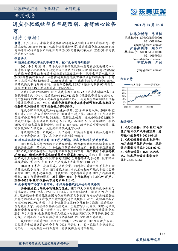 【东吴证券】【20210406】专用设备:通威合肥线效率良率超预期,看好核心设备商-4页