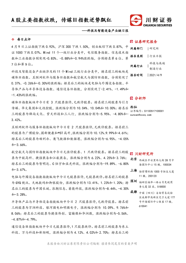 【川财证券】【20210409】科技及智能设备产业链日报:A股主要指数收跌,传媒Ⅲ指数逆势飘红-4页