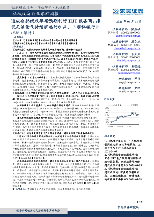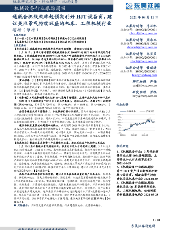 【东吴证券】【20210411】20210411-东吴证券-机械设备行业跟踪周报:通威合肥线效率超预期利好HJT设备商,建议关注景气持续旺盛的机床、工程机械行业-20页