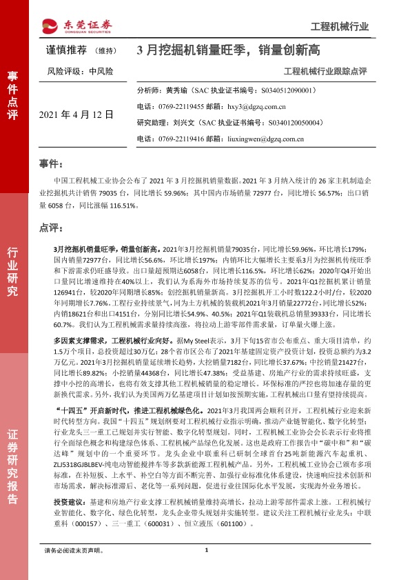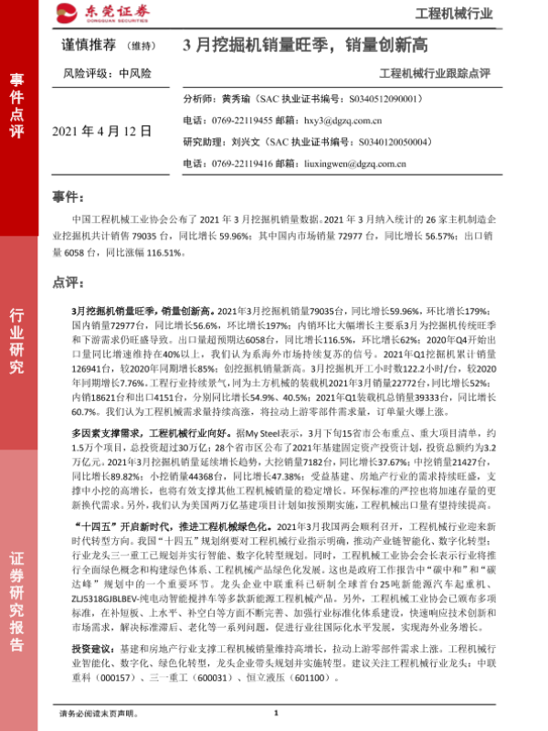 【东莞证券】【20210412】20210412-东莞证券-工程机械行业跟踪点评:3月挖掘机销量旺季,销量创新高-3页